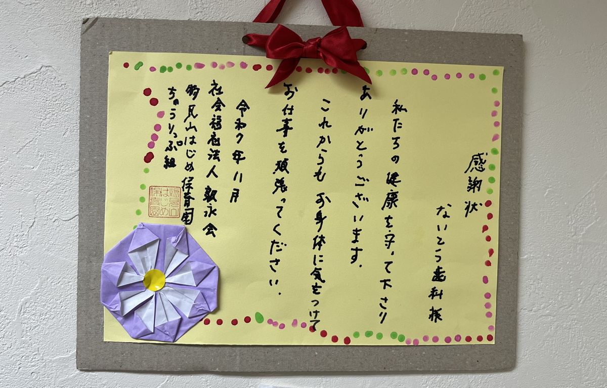 昨日、物見山はじめ保育園の園児さんから、勤労感謝の「感謝状」をいただきました。「感謝状」をいただく機会はなかなかないので、こちらこそ感謝の気持ちでいっぱいです。